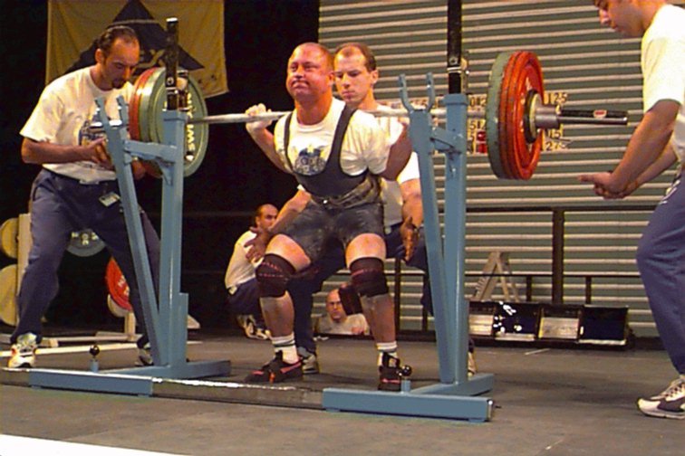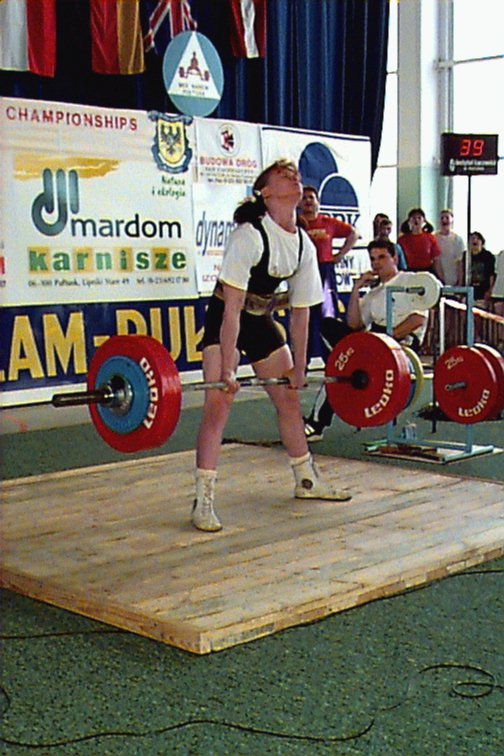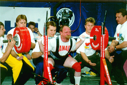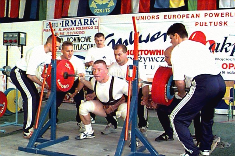 Marek Radola (POL) squatting 300kg at 82.5kg.