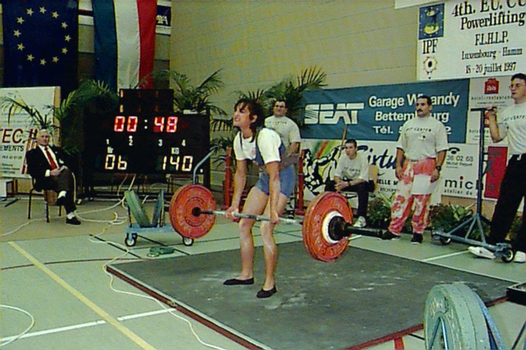 Brigitte Wampach (LUX) squatting 162.5kg at 90kg.