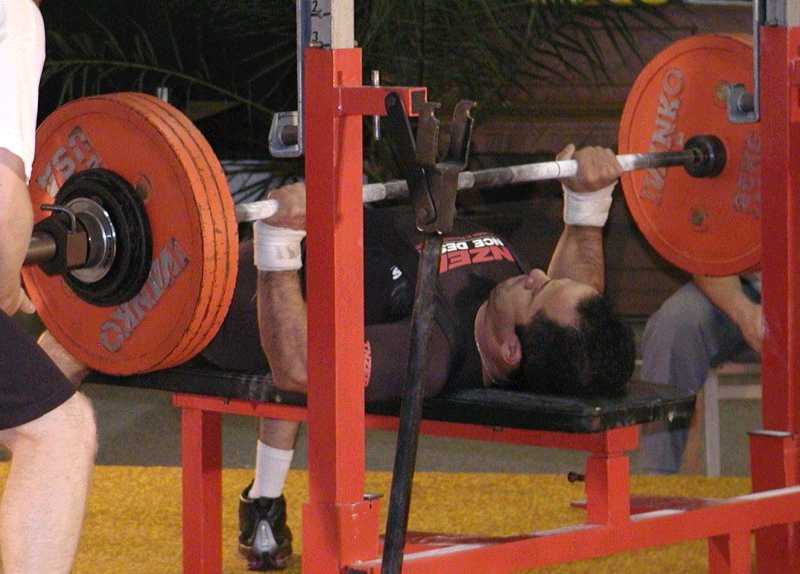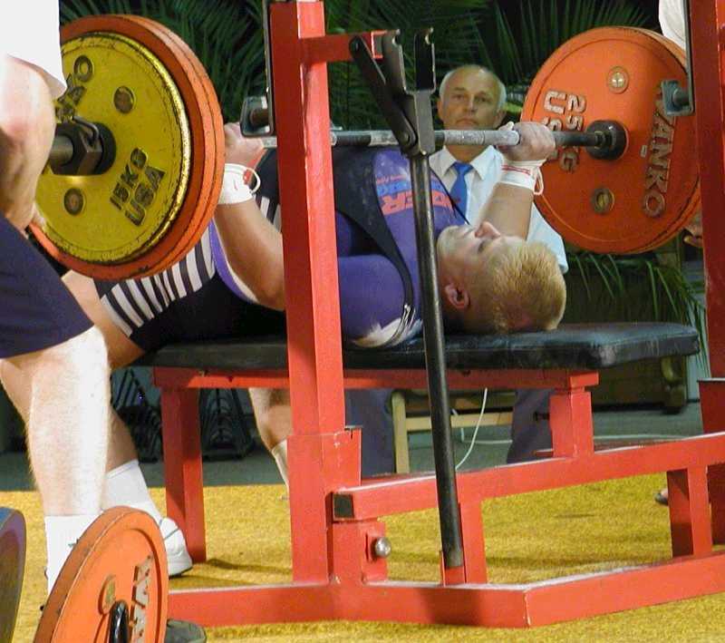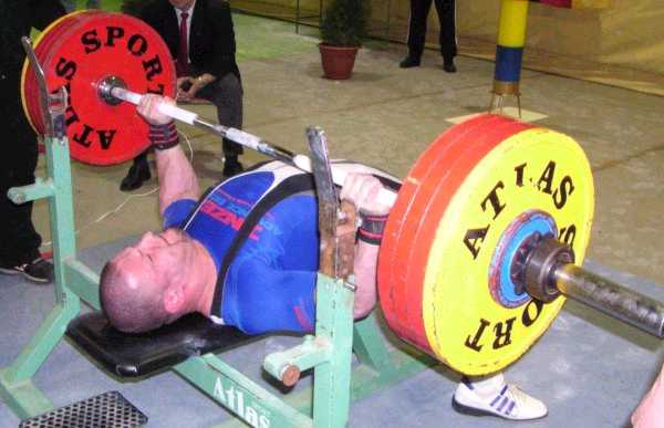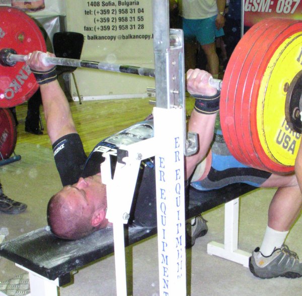 | Eduard Isakov (RUS) bench pressing a world record 292.5kg in the men's 125kg class (Köberich photo). |