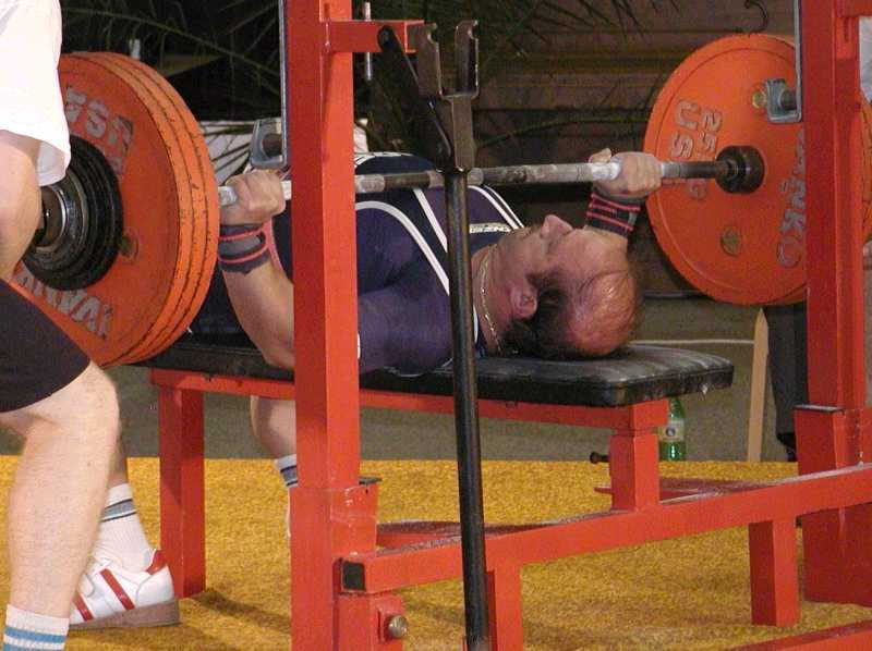Gerhard Grossbeck (AUT) attempting a 210kg bench press in the men's 90kg class (Köberich photo). |