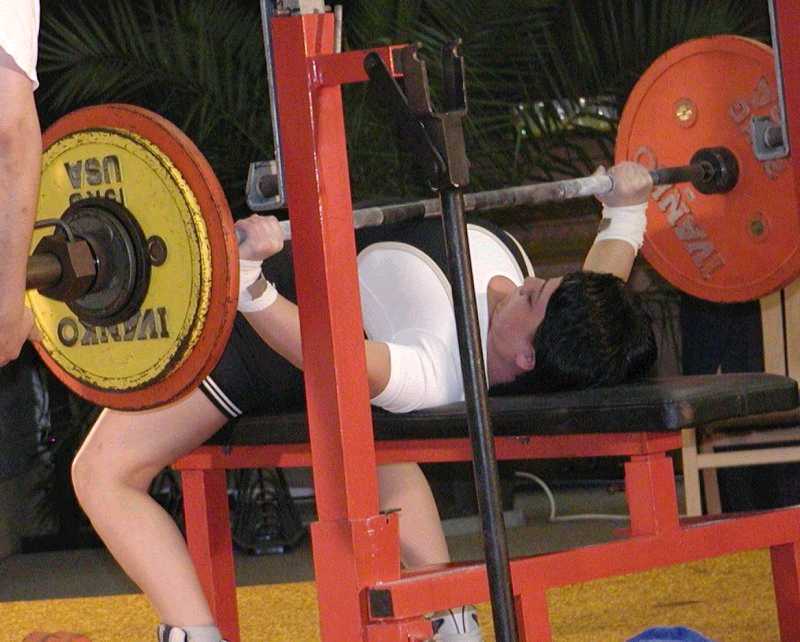 Tagy Parnian (NED) bench pressing a European record 191kg in the men's 60kg class (Köberich photo). |