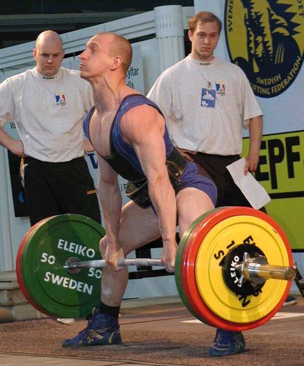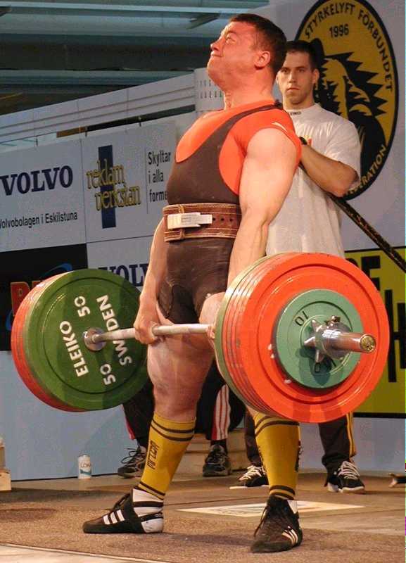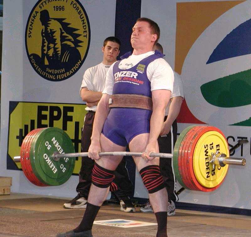 Yury Fedorenko (RUS) deadlifting 355kg in the 100kg class at the 2002 Men's European Powerlifting Championships (Köberich photo). |