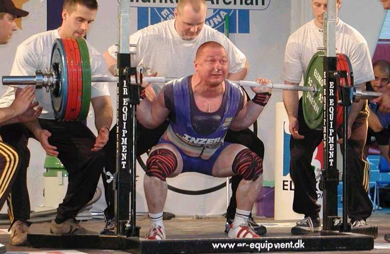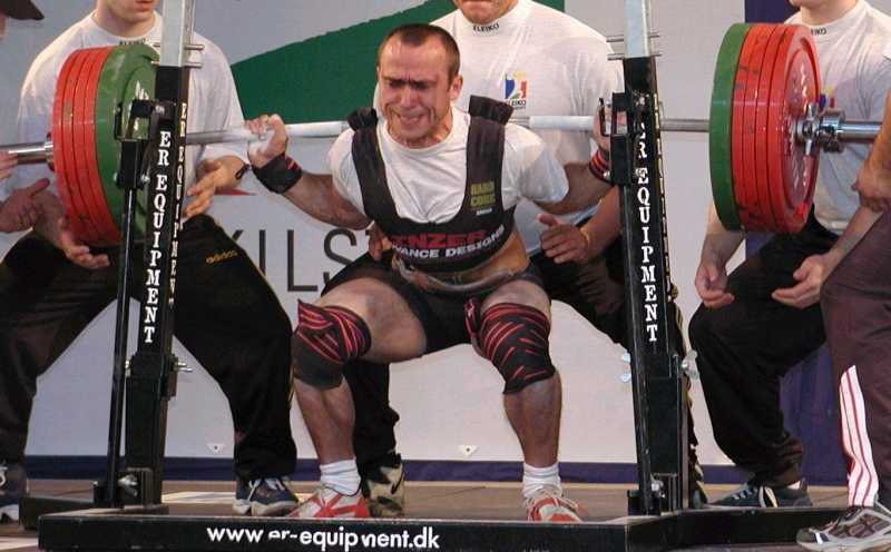| Dmytro Solovyov (UKR) squatting 322.5kg in the 82.5kg class at the 2002 Men's European Powerlifting Championships (Köberich photo). |