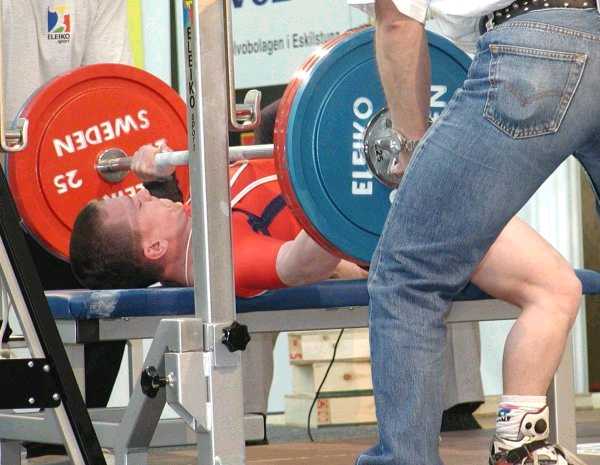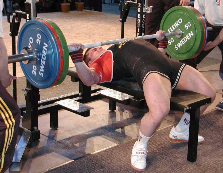 Konstantin Pavlov (RUS) bench pressing 167.5kg in the 56kg class at the 2002 Men's European Powerlifting Championships (Köberich photo). |