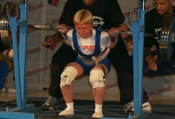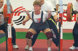 Inger Blikra (NOR) squatting in the 67.5kg class at the 2001 Women's European Powerlifting Championships (Köberich photo). |