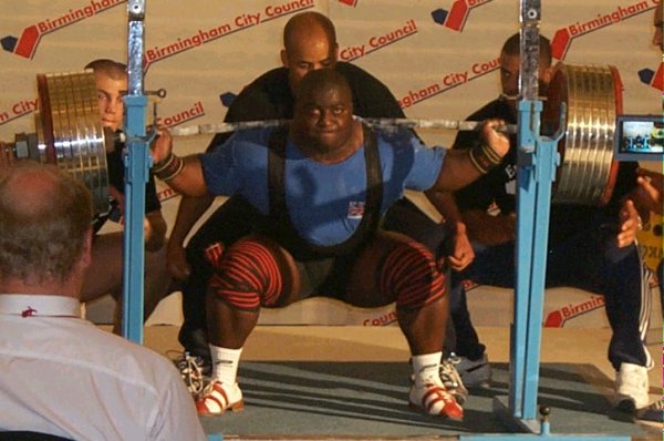 Clive Henry (GBR) squatting an EU Cup Record 385.0kg in the 125kg class at the 2001 EU Cup (Köberich photo). |